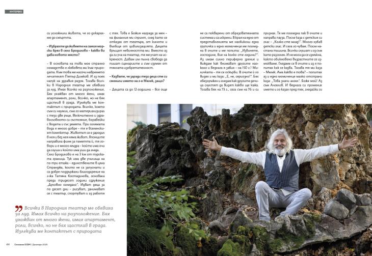Драгомира Сиракова, снимки Добрин КашавеловАктьорът Юрий Ангелов преди 30 години напуска Народния театър и се отказва от апартамента си в столичния квартал „Младост“, за да живее на морския бряг. Първо заживява в село Фазаново, след това се премества в каравана в село Кондолово, близо до Странджа, а последният му дом е в село Бродилово, близо до турската граница. В основата на това негово номадство е любовта му към природата, към която го насочва лечителят Петър Димков. И той поема по този неотъпкан път напук на здравия разум. На 13 ноември актьорът ще навърши 76 г. Роден е в Тотлебен, Плевенско. Завършва ВИТИЗ „Кръстьо Сарафов“ в класа на знаменития Апостол Карамитев. Първите години от кариерата му минават в Драматичен театър – Сливен. След няколко сезона там отива в трупата на Народния театър „Иван Вазов“. Има над двадесет роли в киното. Снимал се е в „Завръщане от Рим“, „И дойде денят“, „Сладко и горчиво“ и др. Играл е и на сцената на бургаския театър „Адриана Будевска“, а пред камера застава за снимките на сериала „Седем часа разлика“ за ролята на Распутин. За решението си да се установи далеч от шума и суетата на столицата актьорът споделя, че основна роля са изиграли последните думи на учителя му Апостол Карамитев: „Как не проумях, че този живот е един голям маскарад“.