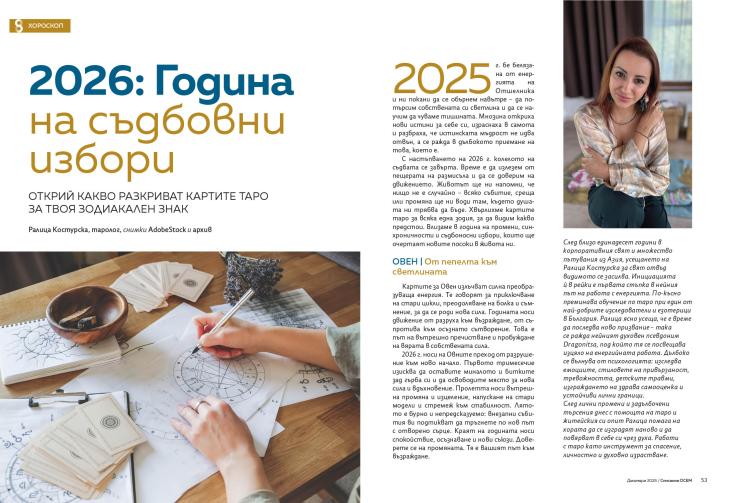 Ралица Костурска, таролог2025 г. бе белязана от енергията на Отшелника и ни покани да се обърнем навътре – да потърсим собствената си светлина и да се научим да чуваме тишината. Мнозина откриха нови истини за себе си, израснаха в самота и разбраха, че истинската мъдрост не идва отвън, а се ражда в дълбокото приемане на това, което е. С настъпването на 2026 г. колелото на съдбата се завърта. Време е да излезем от пещерата на размисъла и да се доверим на движението. Животът ще ни напомни, че нищо не е случайно – всяко събитие, среща или промяна ще ни води там, където душата ни трябва да бъде. Хвърлихме картите таро за всяка една зодия, за да видим какво предстои. Влизаме в година на промени, синхроничности и съдбоносни избори, които ще очертаят новите посоки в живота ни.