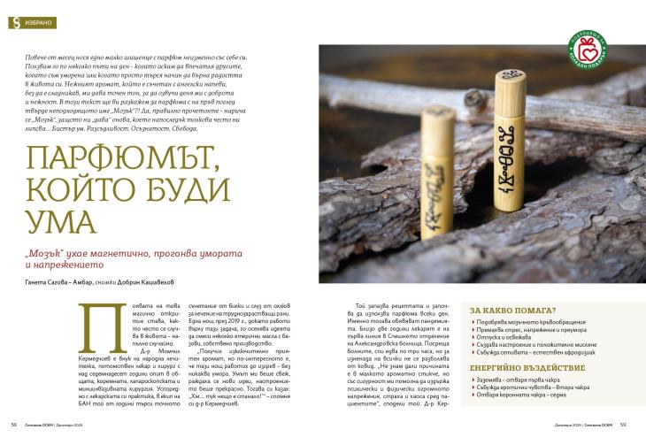 Ганета Сагова – АмбарПовече от месец нося едно малко шишенце с парфюм неизменно със себе си. Ползвам го по няколко пъти на ден – когато искам да впечатля другите, когато съм уморена или когато просто търся начин да върна радостта в живота си. Нежният аромат, който е съчетан с ангелски напеви, без да е сладникав, ми дава точен тон, за да озвучи деня ми с доброта и нежност. В този текст ще ви разкажем за парфюма с на пръв поглед твърде неподходящото име „Мозък“?! Да, правилно прочетохте – нарича се „Мозък“, защото ни „дава“ онова, което напоследък толкова често ни липсва… Бистър ум. Разсъдливост. Осъзнатост. Свобода.