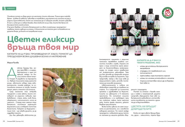 Мария РусеваПонякога пътят ни води далеч от местата, които обичаме. Помня едно такова време – живеех в чужбина, чувствах се тревожна, разстроена от липсата на род и родина. Единственото, което ми помагаше да се събирам наново, когато избухвах в плач и исках да си събера багажа, бяха капките на д-р Бах, които бях взела от България като малка утеха. И до днес вярвам, че когато вътрешният ни свят се разклаща, природата е първата, която идва да ни утеши. А болестите на тялото днес са болежките на душата вчера, за които не направихме нищо.