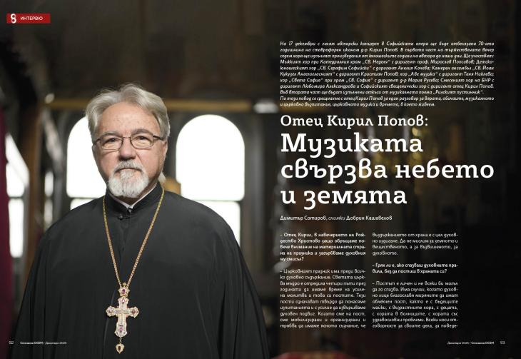 Димитър СотировНа 17 декември с голям авторски концерт в Софийската опера ще бъде отбелязана 70-ата годишнина на ставрофорен иконом д-р Кирил Попов. В първата част на тържествената вечер седем хора ще изпълнят произведения от юношеските години на автора до наши дни. Ще участват: Мъжкият хор при Катедралния храм „Св. Неделя“ с диригент проф. Мирослав Попсавов; Детско-юношеският хор „Св. Серафим Софийски“ с диригент Анелия Кочева; Камерен ансамбъл „Св. Йоан Кукузел Ангелогласният“ с диригент Кристиан Попов; хор „Аве музика“ с диригент Таня Никлева; хор „Света София“ при храм „Св. София“ с диригент д-р Мария Русева; Смесеният хор на БНР с диригент Любомира Александрова и Софийският свещенически хор с диригент отец Кирил Попов. Във втората част ще бъдат изпълнени откъси от музикалната поема „Рилският пустинник“. По този повод се срещнахме с отец Кирил Попов за един разговор за вярата, обичаите, музикалното и църковно възпитание, църковната музика и времето, в което живеем.