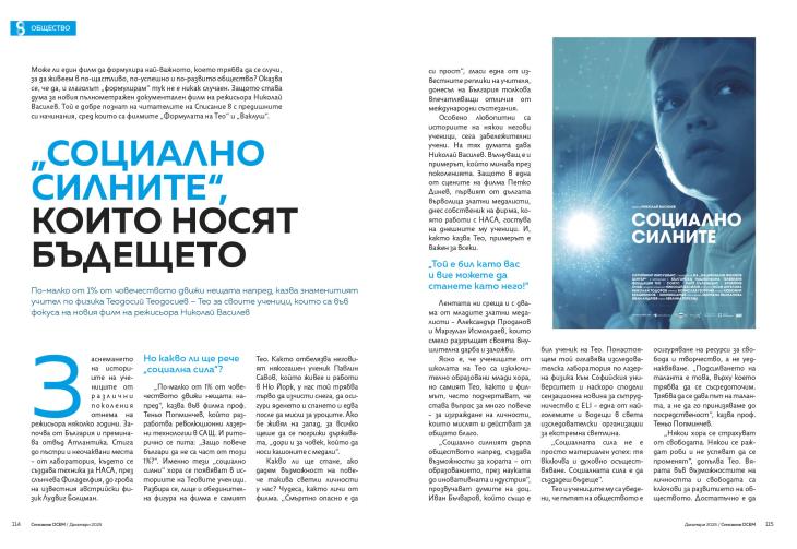 Може ли един филм да формулира най-важното, което трябва да се случи, за да живеем в по-щастливо, по-успешно и по-развито общество? Оказва се, че да, и глаголът „формулирам“ тук не е никак случаен. Защото става дума за новия пълнометражен документален филм на режисьора Николай Василев. Той е добре познат на читателите на Списание 8 с предишните си начинания, сред които са филмите „Формулата на Тео“ и „Ваклуш“.СВЕТИ МОДЕСТ ЙЕРУСАЛИМСКИ