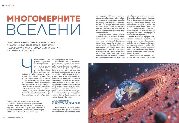 Темата за многомерните вселени започва да излиза от сянката на конспирациите с появата на все по-чести съобщения в масмедиите за общуване на земни хора със същества от паралелни реалности, както и за наличието на експериментални научни данни. Понятието се изследва с научни средства, които дават нов прочит въпреки яростната съпротива на общоприетата наука.- МНОГОМЕРНИТЕ ВСЕЛЕНИ. Сред сънародниците ни има хора, които пишат, рисуват, изобретяват невероятни неща. Възможно ли е това да са проявления на паралелни светове?