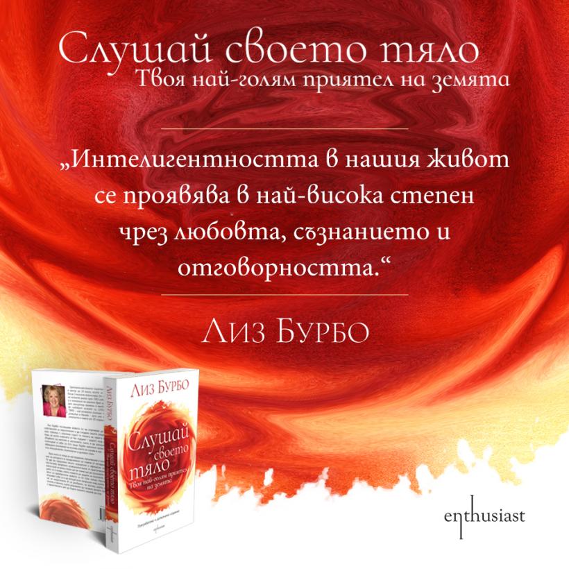 Лиз Бурбо e една от най-известните психоложки в света, която извървява дълъг път към успеха, преди да придобие световна слава. Тя посвещава живота си на стремежа да преодолява собствените си ограничения и да споделя своите открития с широката публика. С огромна страст помага на хората да постигнат това, за което жадуват – радост, мир, спокойствие, сбъдване на мечтите и желанията, както и да разкрият огромния потенциал в себе си. Ето защо Бурбо напомня колко е важно да обръщаме внимание на всичко, което се случва в нас – във физически, емоционален, психически и духовен план. На 20 март тя представи пред българските си почитатели своя бестселър - „Слушай своето тяло“, издаден от „Ентусиаст“. Книгата е разпродадена в тираж от над 1 млн. копия по света и е преведена на 19 езика. Чрез нея Бурбо учи как да бъдем здрави, да открием мисията си в живота и да изградим хармонични отношения със себе си и другите.
