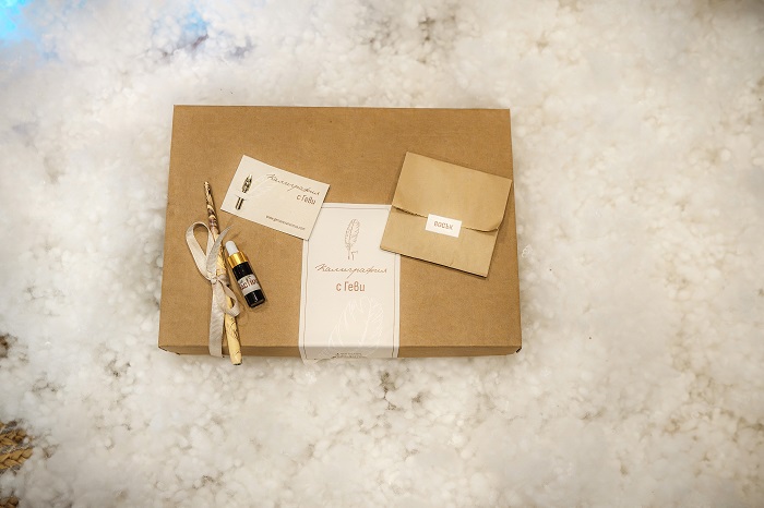 Предлага се в две разновидности: с образец на изписване на буквите от глаголицата и с буквите от нашата кирилица. Кутията съдържа: шишенце с мастило, метално перо и перодръжка, луксозни листове за упражнения, подарък изненада, достъп до затворена група в телеграм с уроци по калиграфия и разговори по темата. Доставя се в изискана подаръчна опаковка.