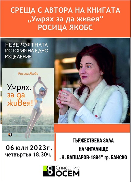 На 6 юли в Банско (в читалище „Н.Й.Вапцаров") от 18.30 ч. може да се срещнете с автора на книгата„Умрях, за да живея“. Елате и чуйте от самата Росица Якобс нейната невероятна история, която продължава да ни вдъхва вяра за живот и увереност, че там отвъд