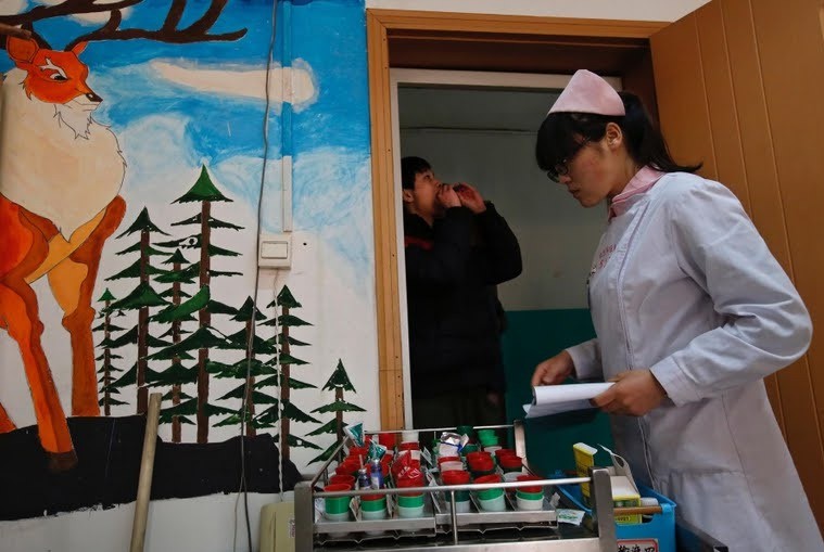 Сестра разпределя лекарствата в центъра за лечение на интернет зависимост Даксин.
