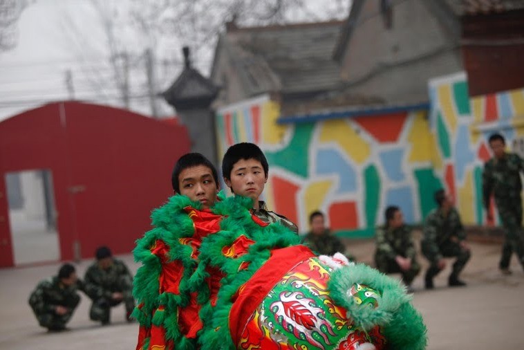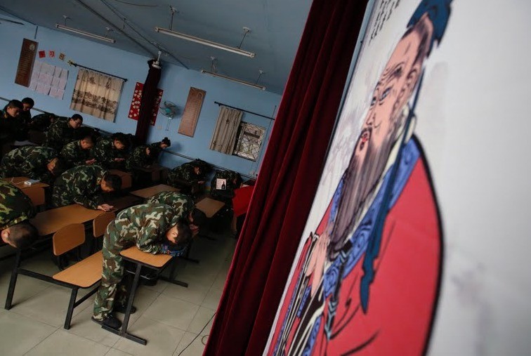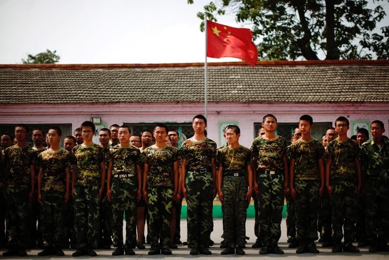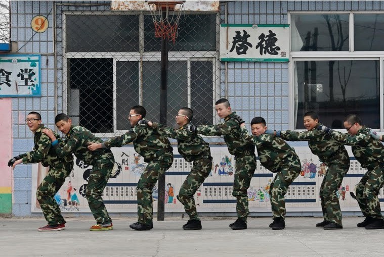 Група момчета стоят пред китайския национален флаг, подготвяйки се да вземат участиe в своеобразна военна тренировка.