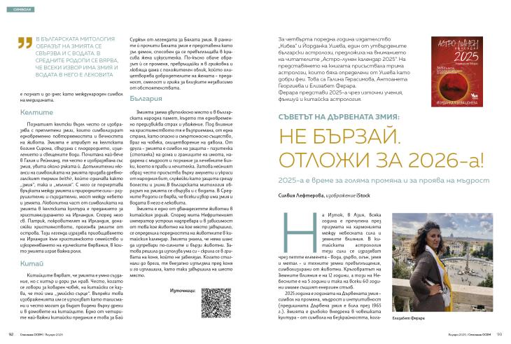 - СЪВЕТЪТ НА ДЪРВЕНАТА ЗМИЯ: НЕ БЪРЗАЙ. ОТЛОЖИ ЗА 2026-А! 2025-а е време за голяма промяна и за проява на мъдрост. За четвърта поредна година издателство „Кибеа“ и Йорданка Ушева, един от утвърдените български астролози, предложиха на вниманието на читателите „Астро-лунен календар 2025“. На представянето на книгата присъстваха трима астролози, които бяха определени от Ушева като добри феи. Това са Галина Герасимова, Антоанета Георгиева и Елизабет Ферара.