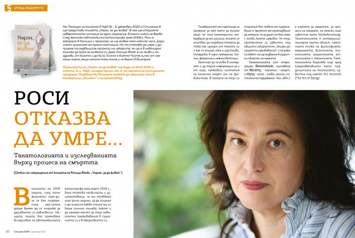 На Панаира на книгата в НДК (6 - 11 декември 2022 г.) Списание 8 ще представи книгата „Умрях, за да живея“. В нея ще откриете невероятната история за едно изцеление, в което никой не вярва. След жестока автомобилна катастрофа през 2008 г. Роси е закарана в болница с прогноза, че ще живее само няколко часа. Дори искат органите за трансплантация. Но тя отказва да умре и да приеме последващите прогнози на лекарите, че ще е в инвалидна количка до края на живота си. Днес Росица Якобс е по-жива и по-здрава, от когато и да било. Елате я вижте! Чуйте лично от нея защо оцеля, защо написа тази книга и се върна в България.Премиерата на „Умрях, за да живея“ ще бъде на 10.12.2022 г., събота, 11 ч., НДК, западно крило, ет. 4, на сцената на културната програма. Очакваме ви! Книгата можете да закупите само в книжарници „Хеликон“ и на spisanie8.bg.
