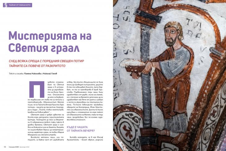 Текст и снимки: Румяна Николова и Николай ГеновПървото споменаване на Светия граал е в историята за разпъването на Иисус Христос. Описанията за него са безброй, но независимо от това те са непълни и противоречиви. Евангелистът Матей пише, че на Тайната вечеря Христос взел потира – чашата за причастие, благодарил и казал: „Пийте, това е моята кръв, кръвта на Новия завет“…