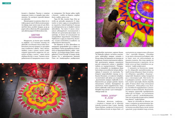 Славяна СечковаТози мистичен феномен се появява за пръв път около VI век пр.Хр., когато учениците на Сидхарта Гаутама, основателя на будизма, следват Пътя на коприната, за да разпространят учението на своя Буда. Така те пренасят и изкуството за създаване на мандала. Преведен буквално от санскрит, терминът означава „кръг“ – символ на целостта, пълнотата и непрекъснатото движение.