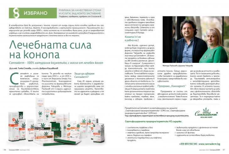 Д-р инж. Гинка СтоеваВ ноемврийския брой ви запознахме с конопа, познат от хиляди години като основна суровина при производството на текстил, въжета, в маслодобивната и хартиената промишленост. Приложението му с медицинска цел започва преди 5000 г., като листата му са поставяни върху рани, за да се предотвратят инфекции и да се ускори заздравяването им. Днес, благодарение на широкото използване в медицинската и козметичната промишленост продуктите с конопено масло са все по-търсени.