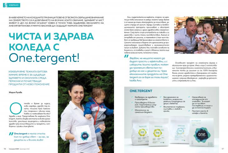 Мария РусеваВ навечерието на коледните празници повече от всякога обръщаме внимание на семейството си и добруването на всички, които обичаме. Здравият и чист живот е цел на всеки осъзнат човек и точно това задвижва желанието на Анелия Витанова и Mинчо Василев да създадат марката One.tergent