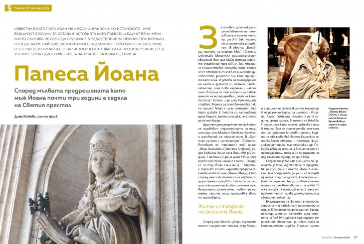 Дима КотеваИзвестна e като папа Йоан VIII и Йоан Английски, но истинското й име всъщност е Йоана. Тя остава в историята като първата и единствена жена, която съумява не само да проникне в недостъпния за нежния пол Ватикан, но и да заеме най-висшата католическа длъжност. Преоблечена като мъж, естествено. Истина ли е това? Историческите факти са противоречиви, сред учените няма единно мнение, а Ватиканът, разбира се, отрича.