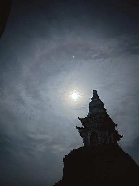 Преобразени се почувствахме и ние, четирима ученици на гуруто, които се качват на терасата на ступата още в нощта на пристигането. Поглеждайки към небето, оставаме без дъх – окръжност като дъга е оградила пълната като бабина погача луна...! Въпреки че чудесата са част от духовния път на всеки, който е осъзнат и искрено търсещ истината, тази гледка разтуптява сърцата ни. Споглеждаме се с Ваджра Аниша (Ани) – и вече знам, че и тя мисли същото като мен. По време на полета до Бали, 20-ина минути преди да кацнем на междинното летище в Доха, се случи друго тайнствено явление. Видяхме яркочервено огнено кълбо във въздуха на 10-ина метра от лявото крило на самолета (в посока на движението). Първоначално помислих, че е огън от нефтена платформа, но стана ясно, че сме на 2 км височина. Други две жени от сангата (общността на практикуващите дарма) също казаха, че са го видели – „червено огнено кълбо“. Едната беше решила, че е падащ метеорит, но то не падаше, а се движеше в посока на полета и дори ни даде време да го огледаме. Но не и да го заснемем.