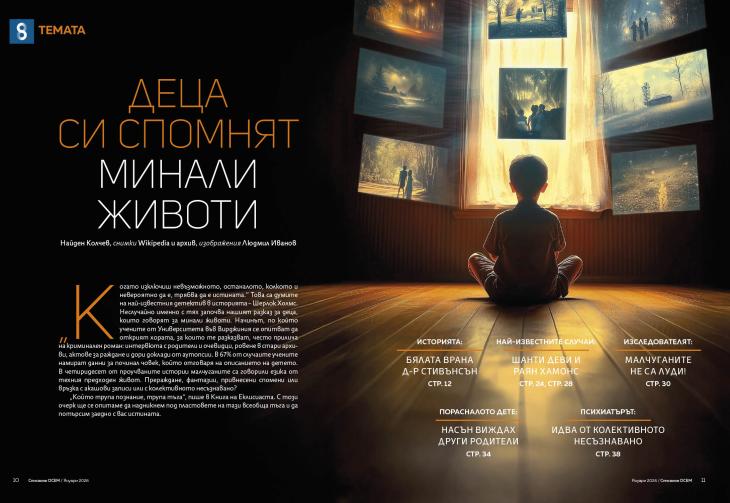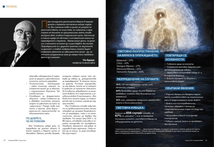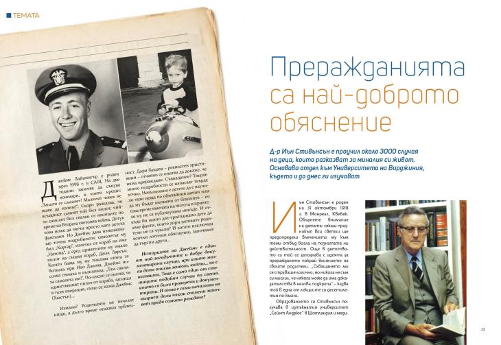 • ПРЕРАЖДАНИЯТА СА НАЙ-ДОБРОТО ОБЯСНЕНИЕ. Д-р Иън Стивънсън е проучил около 3000 случая на деца, които разказват за миналия си живот. Основава отдел към Университета на Вирджиния, където и до днес ги изучават.