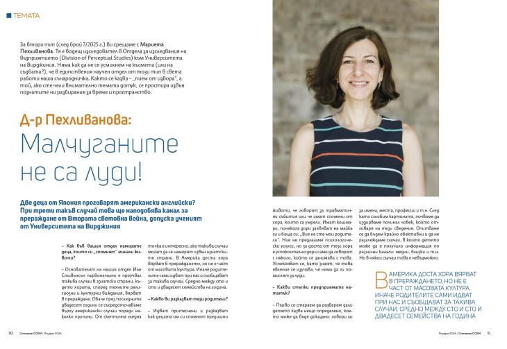 • Д-Р ПЕХЛИВАНОВА: МАЛЧУГАНИТЕ НЕ СА ЛУДИ! За втори път (след брой 7/2025 г.) ви срещаме с Мариета Пехливанова. Тя е водещ изследовател в Отдела за изследвания на възприятието (Division of Perceptual Studies) към Университета на Вирджиния. Няма как да не се усмихнем на късмета (или на съдбата?), че в единствения научен отдел от този тип в света работи наша сънародничка.