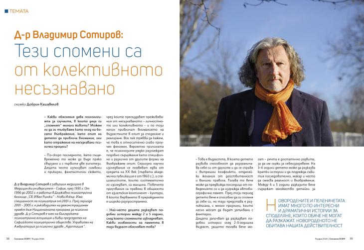 • Д-Р ВЛАДИМИР СОТИРОВ: ТЕЗИ СПОМЕНИ СА ОТ KОЛЕКТИВНОТО НЕСЪЗНАВАНО. Д-р Владимир Сотиров е завършил медицина в Медицински университет – София, през 1995 г. От 1996 до 2002 г. е работил в Държавна психиатрична болница „Св. Иван Рилски” – Нови Искър. Има специалност по психиатрия от 2001 г. Д-р Сотиров е член на Българската психиатрична асоциация и бивш председател на Софийското психиатрично общество. Управител на Амбулатория за психично здраве „Адаптация“