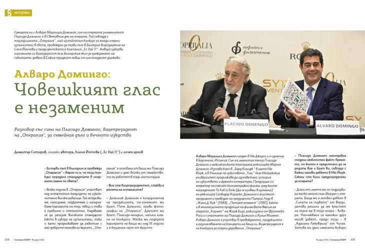 Срещата ни с Алваро Маурицио Доминго, син на оперната знаменитост Пласидо Доминго, е в Световния ден на операта. Той съвпада с тазгодишната „Опералия“, най-изтъкнатия конкурс за млади оперни изпълнители в света, провеждан за първи път в България благодарение на Соня Йончева и продуцентската ù компания „Ес Уай 11“. Алваро изказва огромната си благодарност към българския екип за уреждането на събитието, довело в София тридесет певци от шестнадесет държави.