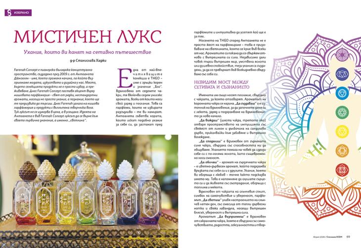 Farenah Concept е пионерско българско концептуално пространство, създадено през 2009 г. от Антоанета Дюнгелян – име, което променя начина, по който възприемаме модата, изкуството и дизайна у нас. Място, където селекцията продукти не е просто избор, а преживяване. Днес Farenah Concept поставя акцент върху нишовата парфюмерия – свят от редки, нестандартни аромати, носещи не просто ухание, а познание, което ще те предизвика да търсиш. Днес Farenah залага на нишова парфюмерия и продукти с въплътена творческа воля. Тук луксът не се измерва в цена, а в усещане. Идеята на Антоанета е във Farenah Concept луксът да се върне към своето първично значение, а именно „светлина“.