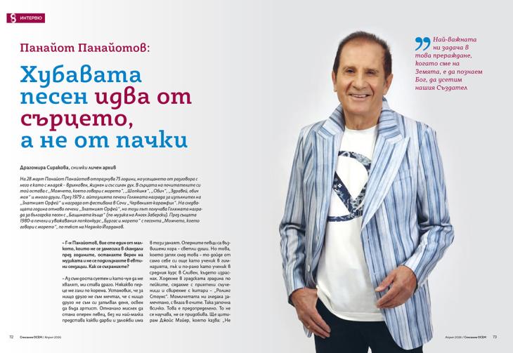 На 28 март Панайот Панайотов отпразнува 75 години, но усещането от разговора с него е като с младеж – вдъхновен, жизнен и със силен дух. В сърцата на почитателите си той остава с „Момчето, което говори с морето“, „Шопкиня“, „Обич“, „Здравей, обич моя“ и много други.