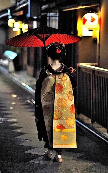В стария квартал на гейшите - Гион - пълнолунието настъпва на котешки лапи, а аз го следвам. Полунощ отдавна остана в очертанията зад един ъгъл. Внезапно, в пълно безмълвие, без да нарушава покоя на херметичната тишина, стената на една древна къща се оказва плъзгаща се врата. Отваря се като в сън. Излиза гейша. Истинска. Hе от онези - наречените „маико“ - хубавичките кръглолики туристически примамки. He. Една истинска гейша не е това, което обикновено считаме за красива жена. Не й е нужно. Oсобено по пълнолуние. Не й е нужно дори да е млада. Точно като самата луна. Тя е отвъд всяка привичка, над всяка условност. Изящна като въздишка. Фина като листенце на спяща хризантема. Боядисаното й в тебеширено-бяло лице е лунно, индиферентно. Тя владее безброй изкуства - всяко едно от тях е непонятно за мен, европеeцa. Гейшата е самият мост в пълнолунието. Магията му.