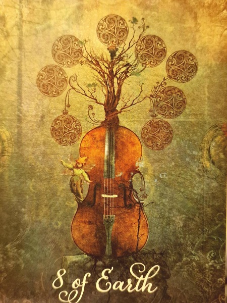 На изображението се вижда цигулка, от чийто гриф са прорасли клонки, окичени с листенца и осем големи златни пентакъла.