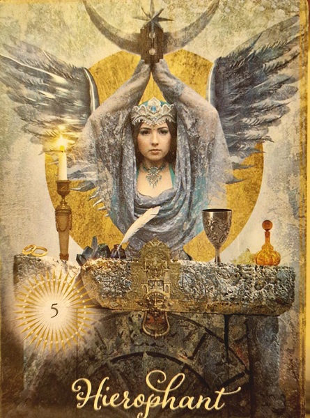 На изображението виждаме жена с крила, вдигнала нагоре ръце, в които държи полумесец и звезда с осем лъча – символи на интуицията и хармонията между дух и материя. На челото й има украшение със син аметист, задействащ третото око. Пред нея има каменна маса с наредени ритуални предмети – златни халки, кристална друза, свещ, перо в мастилница, бокал и стъкленица.