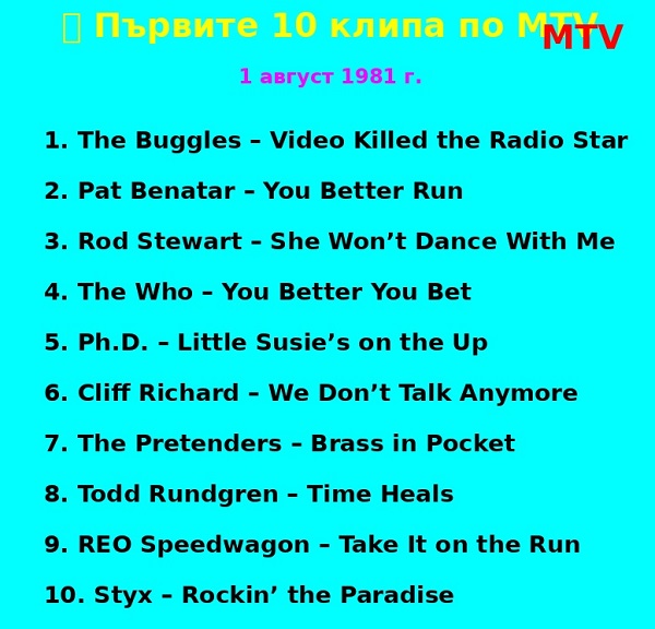 Ето и първият клип, излъчен по MTV на 1 август 1981 г. Ще си го пуснем и в новогодишната нощ, за да затворим още една епоха и погребем още едно любимо нещо на бейбибумърите, поколението Х и ранните милениали.