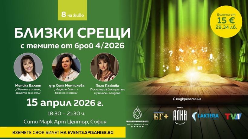 Очакваме ви на 15 април 2026 г. от 18:30 ч. в залата на Сити Марк Арт Център на събитието ни „Близки срещи“. Билети може да закупите на касата на залата или оттук: events.spisanie8.bg.